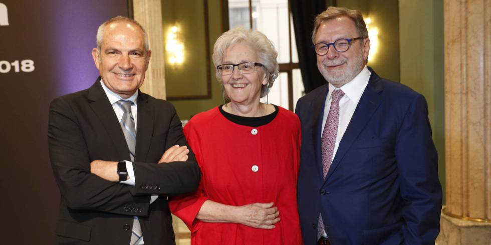 Soledad Gallego-Díaz, acompañada por el director de EL PAÍS, Antonio Caño (izquierda) y Juan Luis Cebrián, presidente del periódico.Ver fotogalería