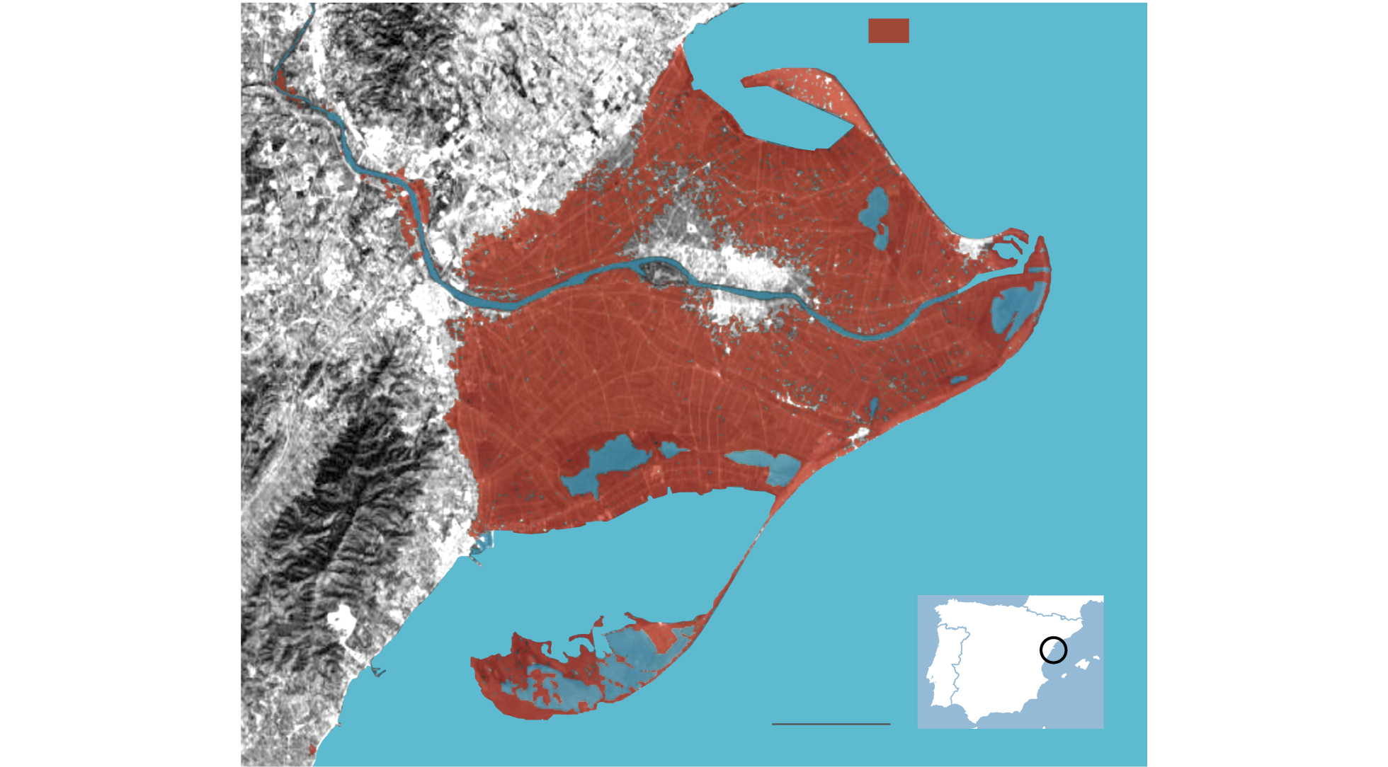 Delta del Ebro. Zonas en riesgo de inundación en 2050 si las emisiones de efecto invernadero crecen como hasta ahora y hay un nivel de deshielo alto.