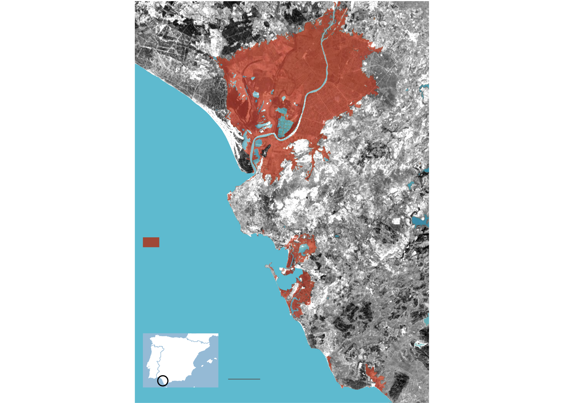 Doñana. Zonas en riesgo de inundación en 2050 si las emisiones de efecto invernadero crecen como hasta ahora y hay un nivel de deshielo alto.