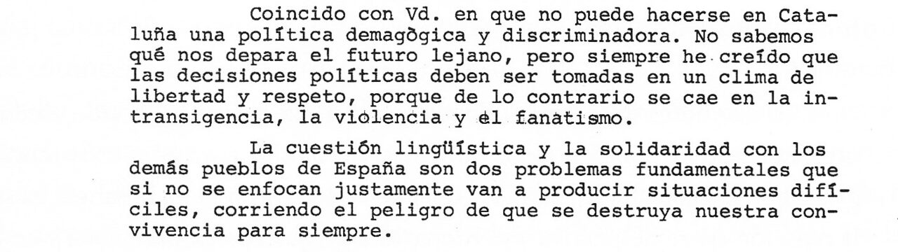 Coincido con Vd. en que no puede hacerse en Cataluña una política demagógica y discriminatoria. No sabemos qué nos depara el futuro lejano, pero siempre he creído que las decisiones políticas deben ser tomadas en un clima de libertad y respeto, porque de lo contrario se cae en la intransigencia, la violencia y el fanatismo.